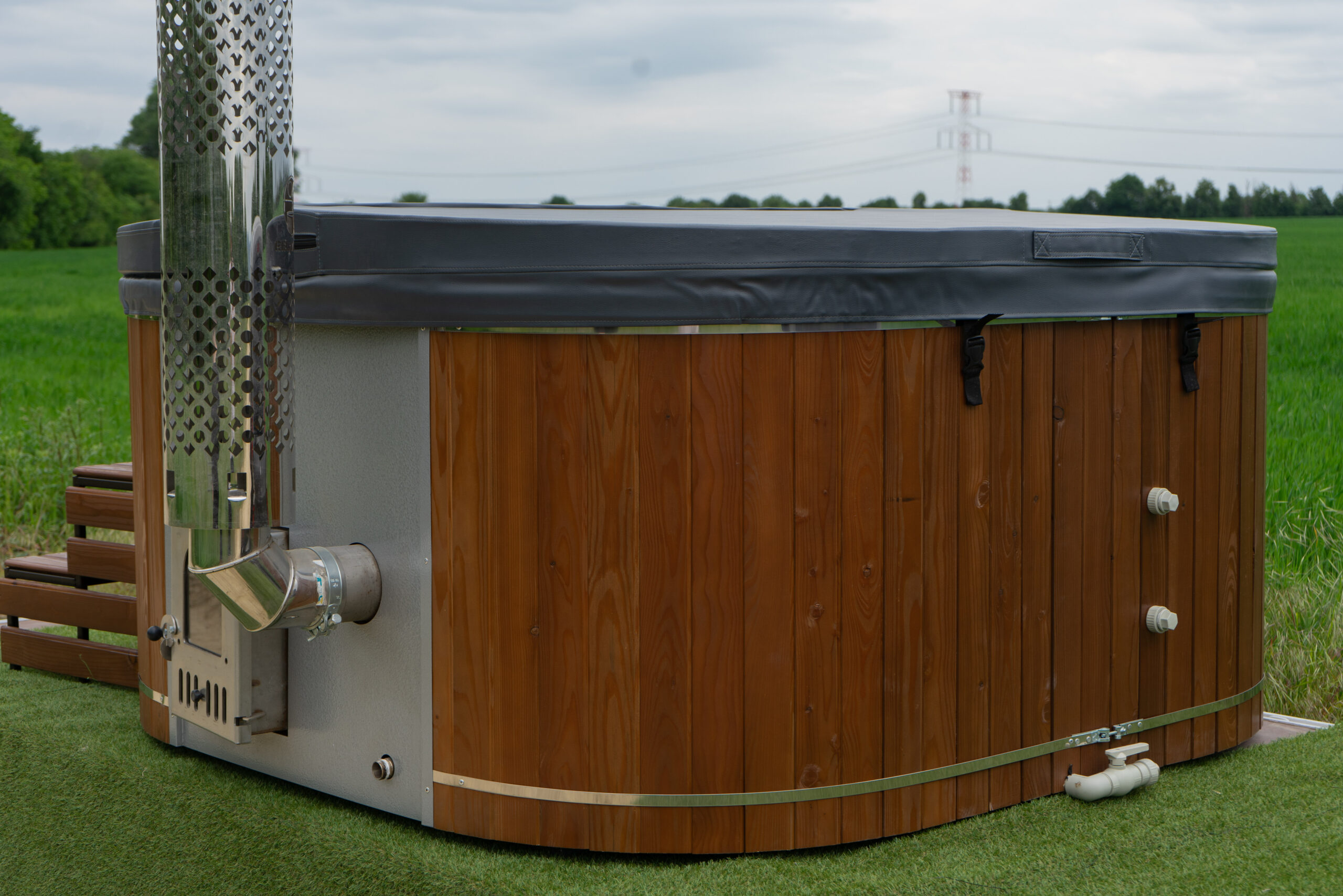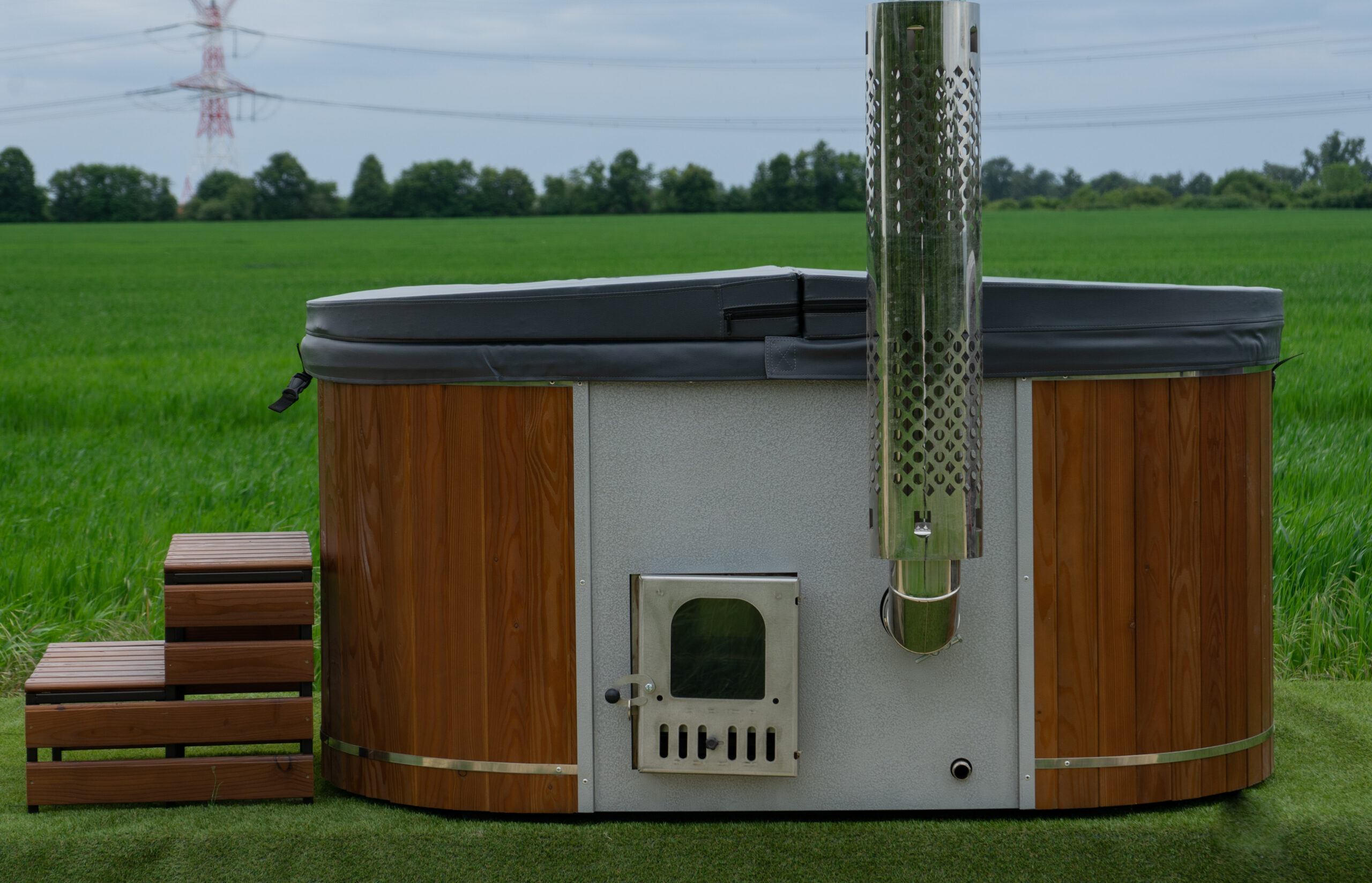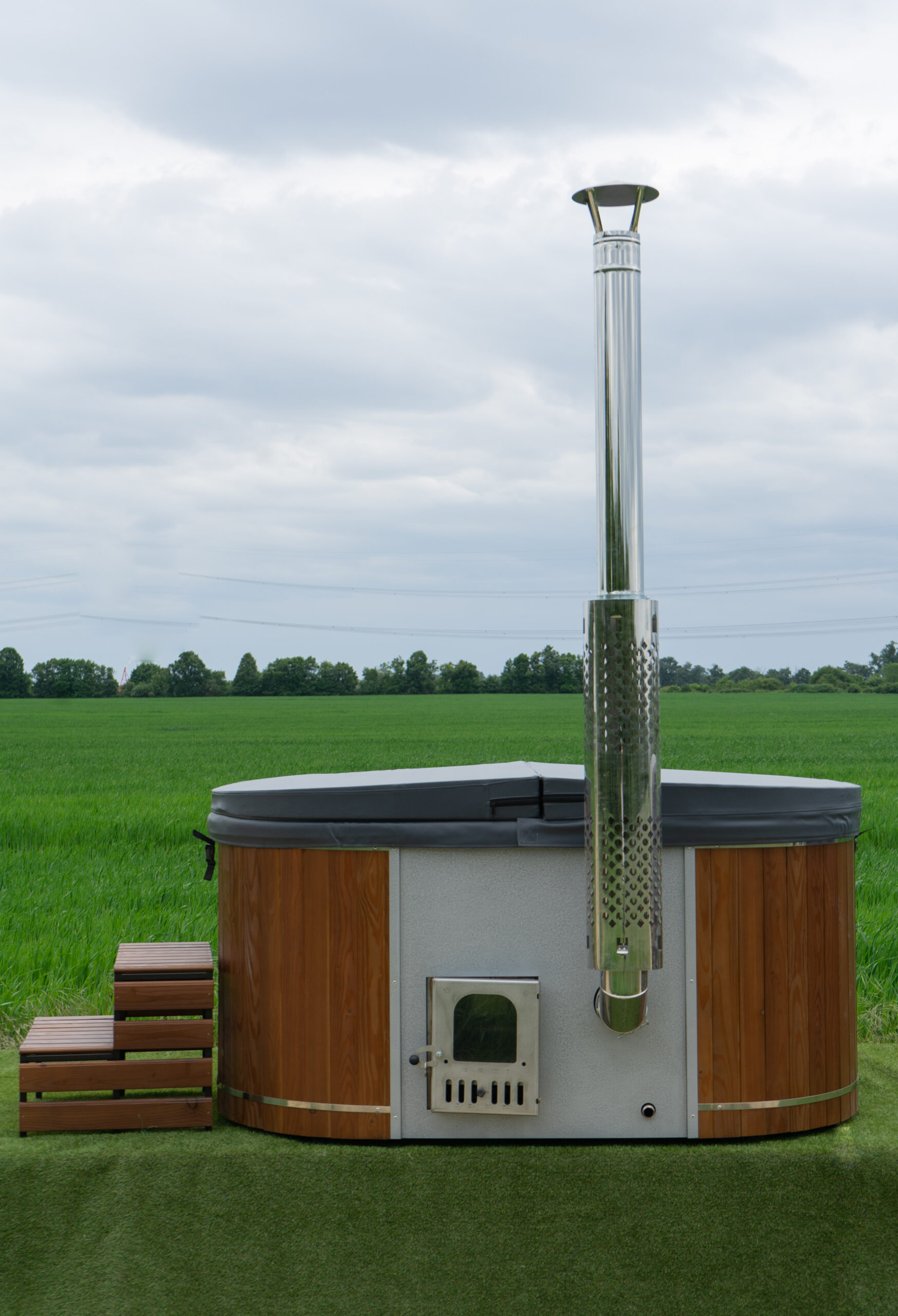 Külső kazános fűtésű dézsáinkat a telepítéskor csak csatlakoztatni kell az előre legyártott csövekre bilincs segítségével, valamint a 2 m-es kéménycsövet és az 1 m-es kéményvédelmet kell felszerelni.