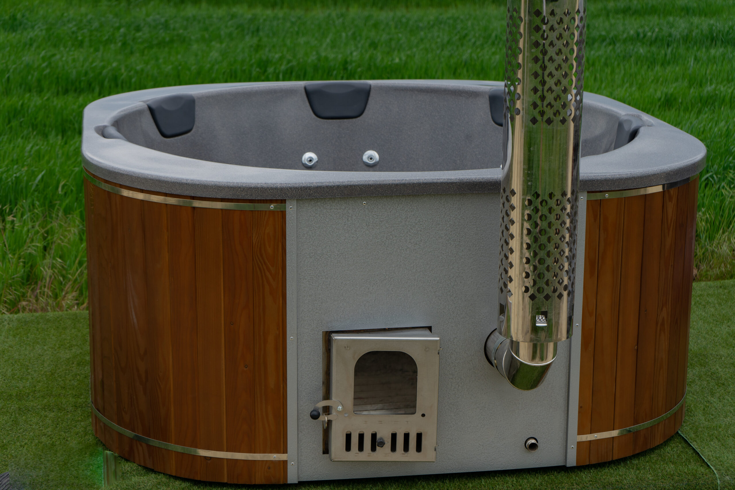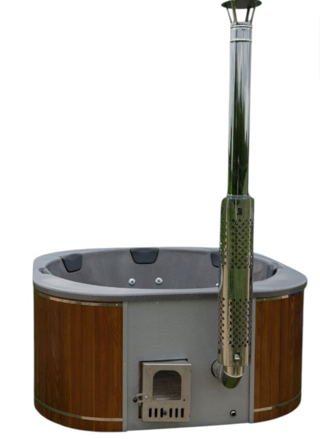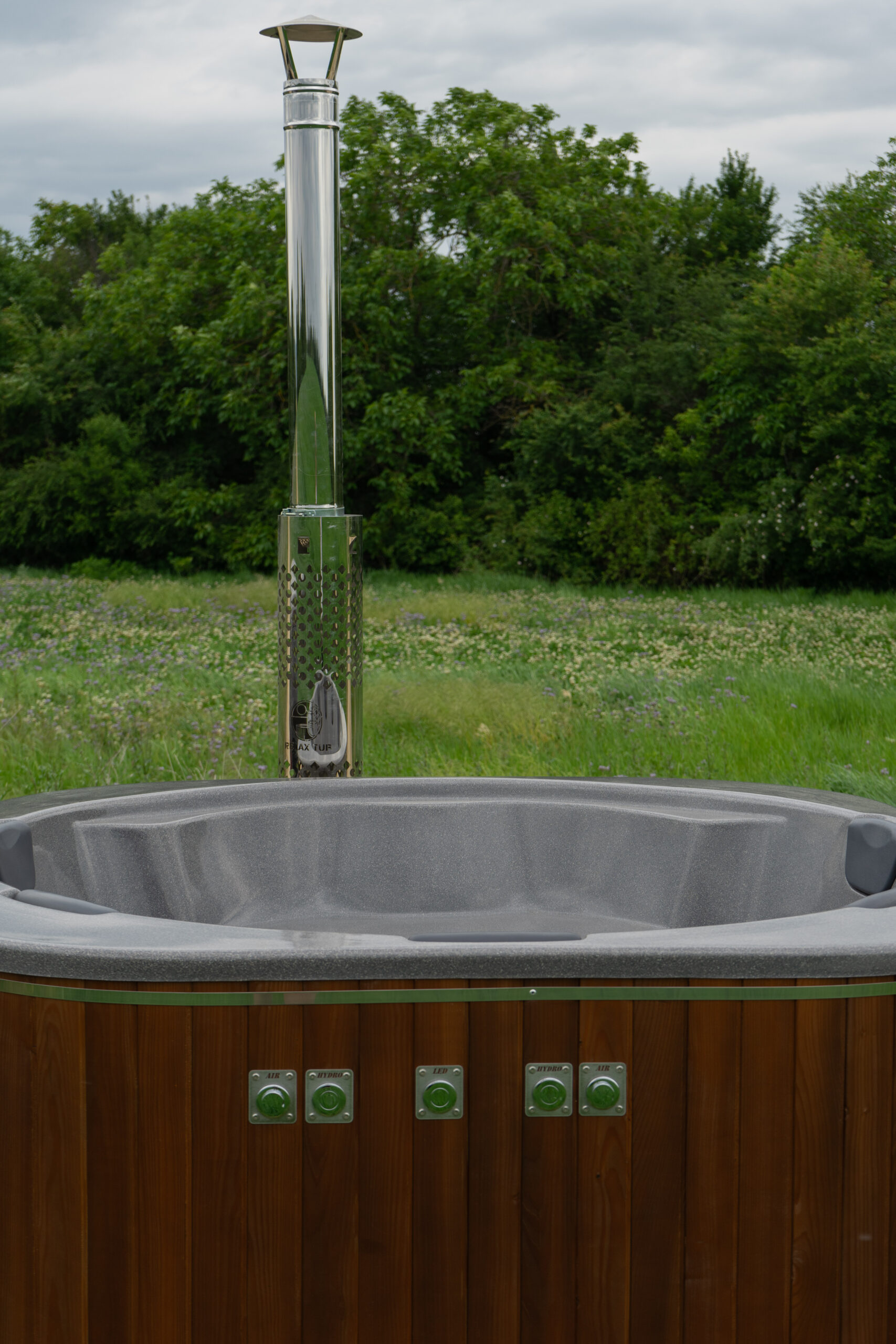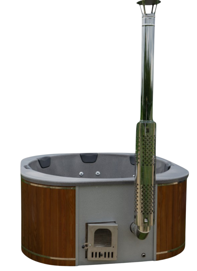 Külső kazános fűtésű dézsáinkat a telepítéskor csak csatlakoztatni kell az előre legyártott csövekre bilincs segítségével, valamint a 2 m-es kéménycsövet és az 1 m-es kéményvédelmet kell felszerelni.